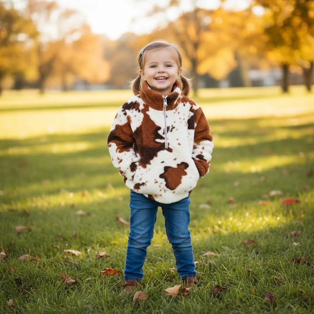 warm cow print half zip long sleeve girls jacket